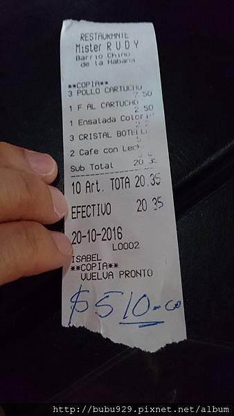 這頓飯價格是20.35CUC,老闆也收CUP,510結帳 (Rate 1:25)。