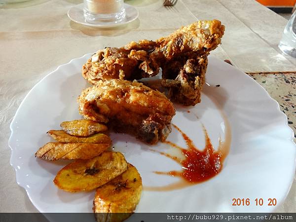 這個重點不在番茄醬花,當然也不是炸雞,而是左下的那個炸香蕉。Rudy 說這是古巴道地的食物。味道挺不錯的,終於在漢堡、義大利麵、三明治之後出現了一些不同的東西了~