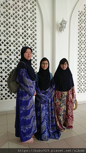 男生必須穿著長褲,而女生全部必須換上免費提供的穆斯林婦女服飾 (哈,我的臉因為吃類固醇變得好大呀!)